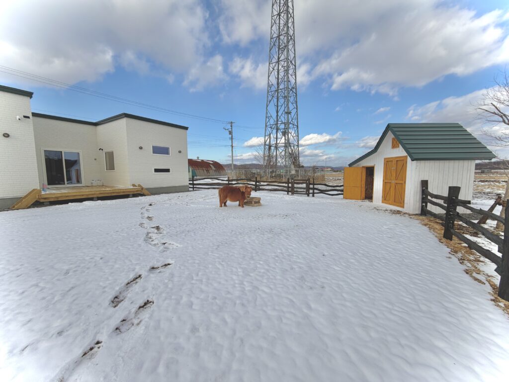 建物のすぐそばで、一頭のミニチュアホースが暮らしています。